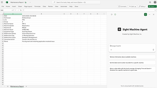 Microsoft 365 Copilot transforms industrial intelligence into natural-language insights for every role. By connecting through Sight Machine’s MCP Server, Copilot and other AI agents can ask complex questions and receive context-aware answers grounded in real factory data.